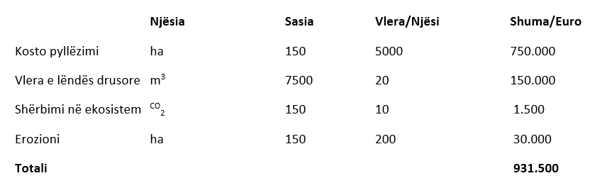 “Nëse llogarisim që vlera e lëndës drusore, që digjet, është e barabartë me 20 euro/m3*50m3/ha = 1000 euro/ha, vlera e shërbimit në ekosistem është 10 euro/ha/vit për 100 vite = 1000 euro/ha kapja e CO2 nga atmosfera, kosto e degradimit të tokës = 200 euro/ha/vit, ky dëm shkon në total 7200 euro/ha”, – shpjegon eksperti, Abdulla Diku.