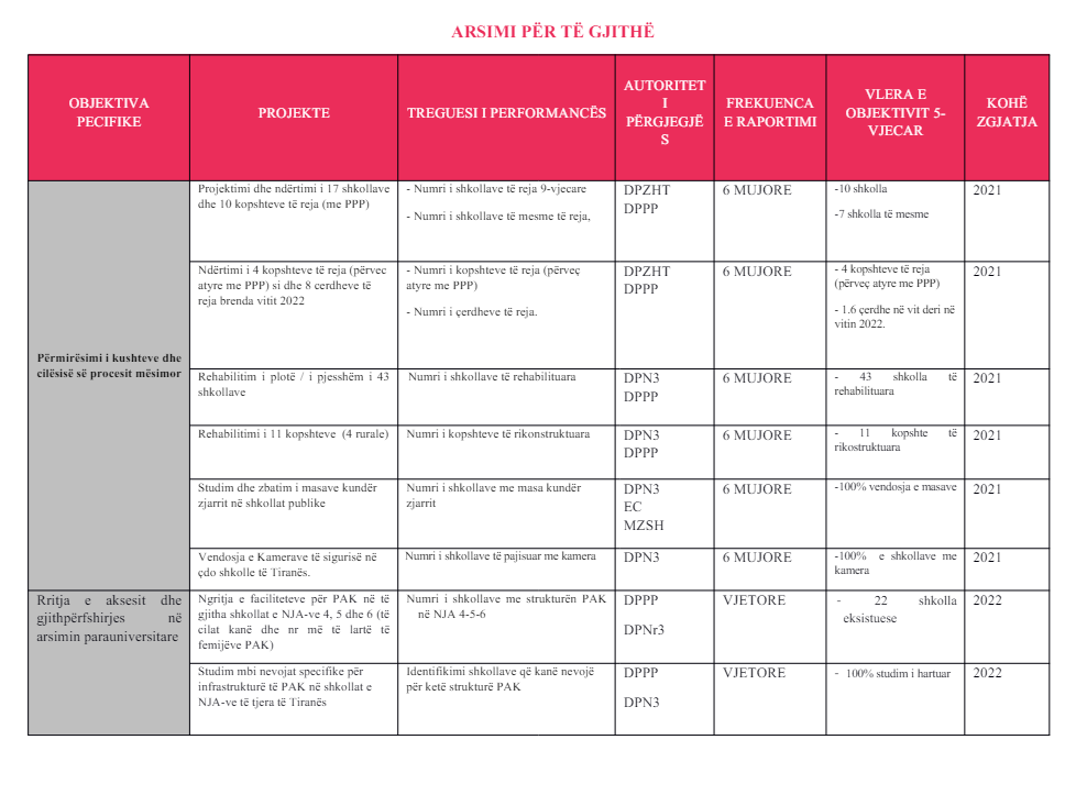 “Infrastrukturë e përmirësuar, arsimore dhe akomoduese përmes ndërtimit të 13 shkollave dhe 22 kopshteve e çerdheve të reja, si dhe ndërtimi i 3 godinave të konvikteve dhe rikonstruksioni i 19 godinave të tjera deri në fund të vitit 2027”, – thuhet në relacionin shoqërues të PBA.