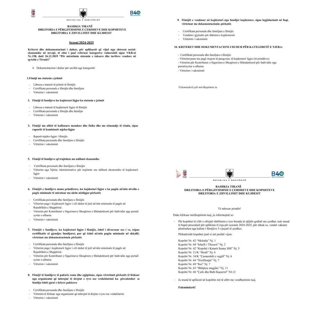 I vetmi dokument i afishuar në dyert e drejtorisë e po ashtu edhe në faqen e saj, zyrtare është lista e dokumenteve që duhet të paraqesë secila kategori prindërish për të aplikuar.