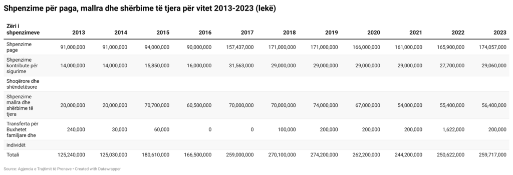 Vetëm për pagat, për sigurimet dhe për shpërblimet shuma është 24 milionë euro. Nga këto plot 60 milionë lekë i kanë marrë të larguarit nga puna të periudhës 2013-2020. Për vitet 2021-2023 nuk ka pasur shpenzime për këtë zë.