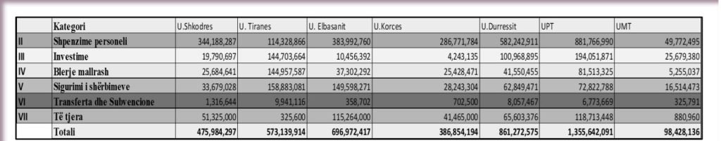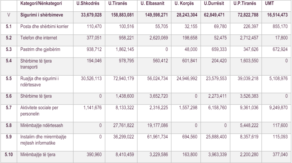 Universiteti Politeknik, një ndër 7 universitetet, që janë marrë në shqyrtim nga Qëndresa Qytetare, regjistron shpenzimet më të larta për shërbime për personelin dhe për honorarë me mbi 8.7 milionë euro, ndjekur nga Universiteti i Tiranës, me mbi 1.1 milionë euro.