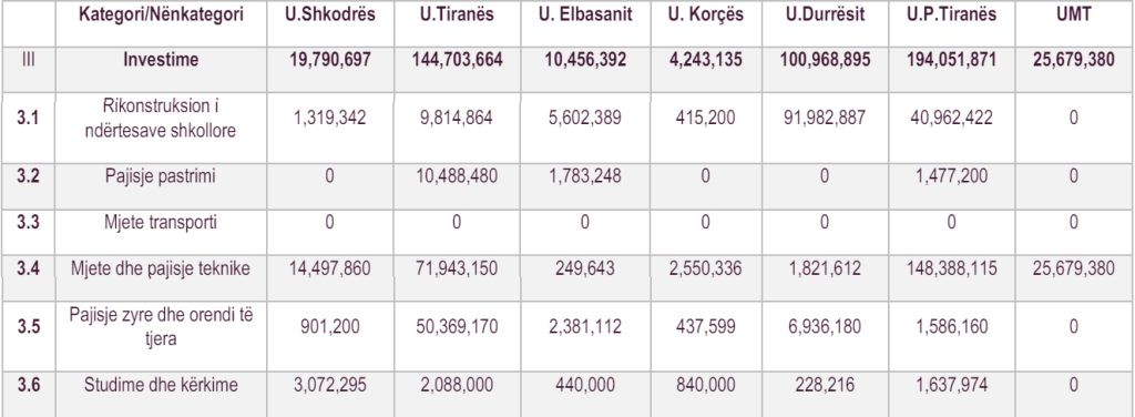 Edhe në kategorinë “Investime” Universiteti Politeknik i Tiranës rezulton të ketë kryer shpenzimet më të larta me mbi 1.8 milionë euro, ku peshën kryesore e zë blerja e mjeteve dhe e pajisjeve teknike, me vlerë 1.413.220 euro.