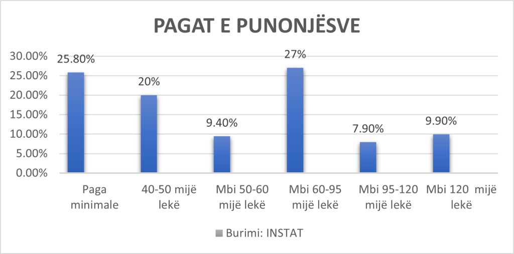 Sipas të dhënave të Institutit të Statistikave, gati 1/3 e totalit të të punësuarve në vend kanë pagë minimale. Referuar shifrave zyrtare, 25.8% e punonjësve ishin me pagë minimale, 20% marrin nga 40-50 mijë lekë dhe 9.4% marrin nga mbi 50 mijë lekë deri në 60 mijë lekë.