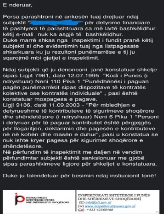 Inspektorati i Punës dhe i Shërbimeve Shoqërore pranon se ka pasur ankesa për mosdhënien e pagave nga fabrikat e mbyllura, por sqaron se nuk është kompetencë e tyre trajtimi i rastit, kur subjekti mbyll aktivitetin. Bazuar në të dhënat e vëna në dispozicion nga Inspektorati i Punës, nga 800 ankesa të bëra një vit më parë, 177 ankesa ishin për mosdhënie page, nga këto ankesa 10 i përkasin sektorit të fasonerisë, ku në pjesën më të madhe fabrikat kishin mbyllur aktivitetin.
