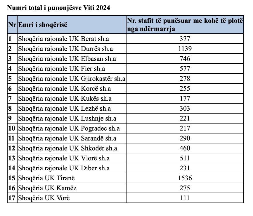 Në vitin 2023, numri total i të punësuarve në sektorin UK ka qenë 7602 punonjës, me një renie nga viti 2022, ku në total kishte 7815 të punësuar. Nga ana tjetër, INA media ka siguruar të dhënat e numrit të punonjësve për vitin 2024, ku shihet një rritje prej 102 punonjës krahasuar me vitin 2023. Për 2024, të dhënat flasin për një shifër prej 7704 të punësuar në këtë sektor, kur nga 14 shoqëritë rajonale dhe shoqëria UK Tiranë, Kamez, Vorë, numrin më të madh të të punësuarve e ka Tirana, e ndjekur nga Durrësi.