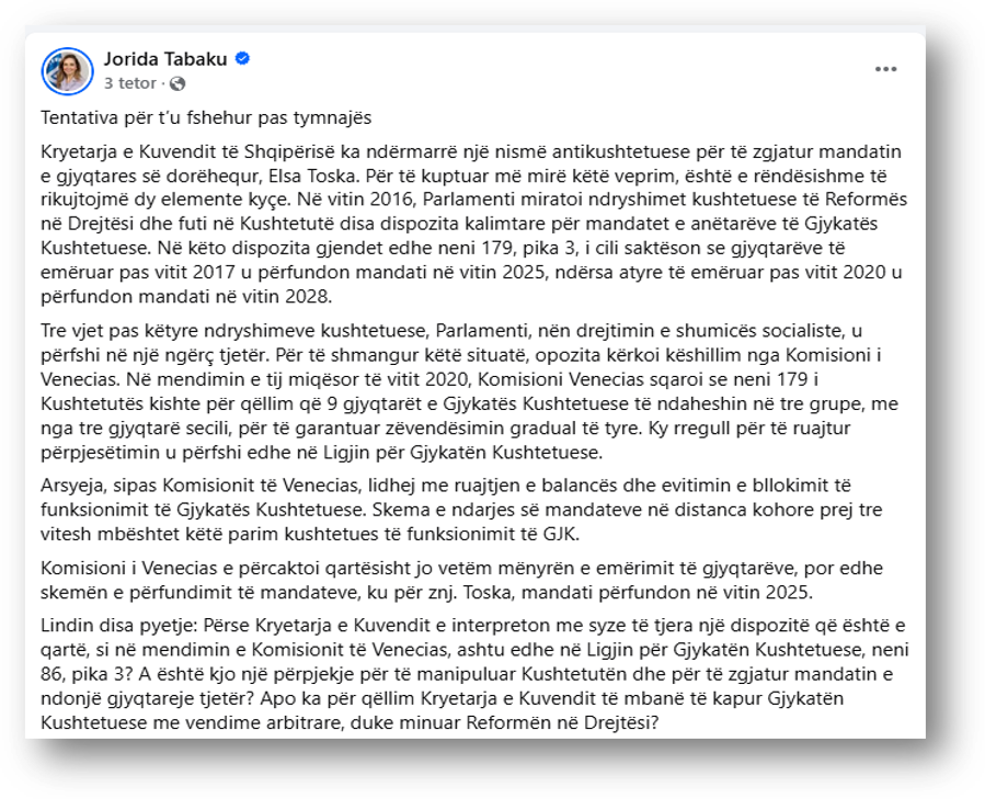 “A është kjo një përpjekje për të manipuluar Kushtetutën dhe për të zgjatur mandatin e ndonjë gjyqtareje tjetër? Apo ka për qëllim kryetarja e Kuvendit të mbajë të kapur Gjykatën Kushtetuese me vendime arbitrare, duke minuar reformën në drejtësi?” – shkroi Tabaku më 3 tetor e që nga ajo ditë, ajo nuk e ngriti më këtë çështje publikisht. “INA Media” e pyeti deputeten nëse ajo iu qëndron ende këtyre deklarimeve dhe pse grupi parlamentar demokrat ku ajo bën pjesë nuk e ka ndjekur këtë çështje, por zonja Tabaku nuk dha asnjë koment.